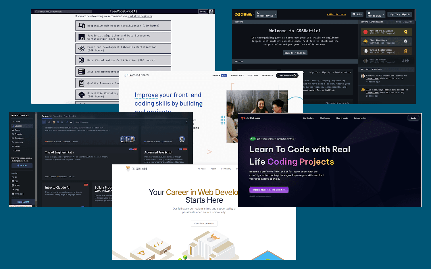 من أفضل الطرق لتعلم البرمجة هي بالتأكيد بناء المشاريع وحل المشكلات الواقعية. المعرفة النظرية جيدة، ولكن بدون تطبيق المعرفة التي تتعلمها، لن ترى التقدم في تحسين مهاراتك التي سوف تنعكس على تطورك المهني. أقدم لك قائمة بـ 7 مواقع ويب لمساعدتك على التحسن في تطوير الواجهة الأمامية من خلال الممارسة العملية المدعومة بالمعرفة النظرية.